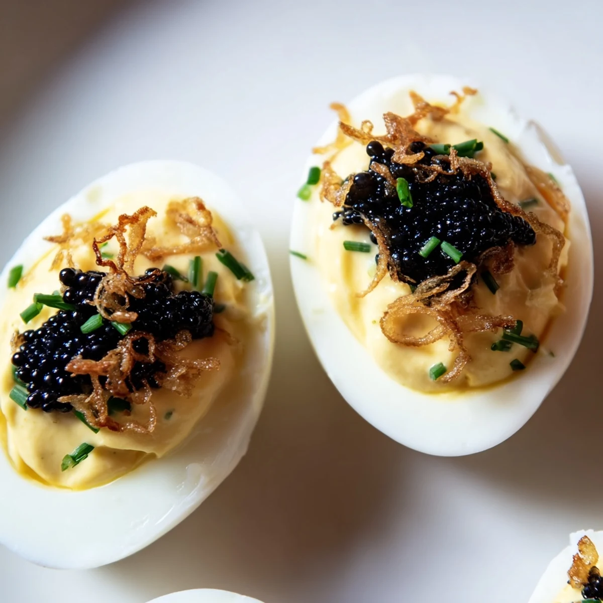 - Just before serving, top each deviled egg with a small dollop of caviar and a sprinkle of those crispy shallots. Garnish with chives if you have them, then serve right away while everything is still cold and the shallots are still crunchy.