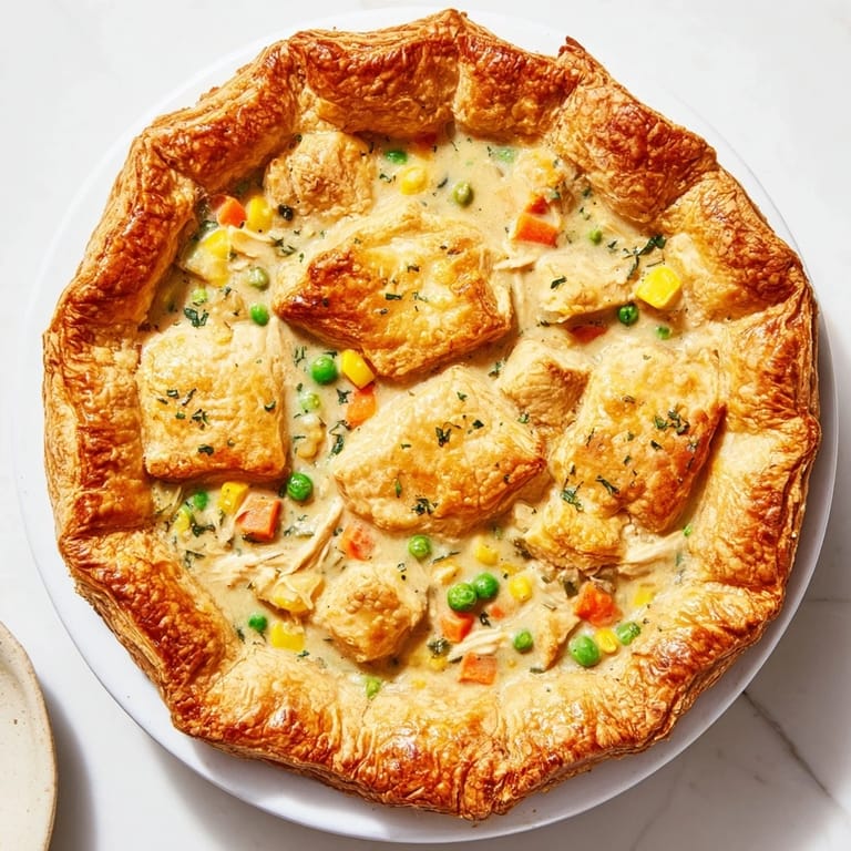 Pin it A rustic, comforting chicken pot pie infused with aromatic bay leaf and fresh herbs, nestled beneath a golden, flaky pastry crust. Perfect for cozy dinners and family gatherings.