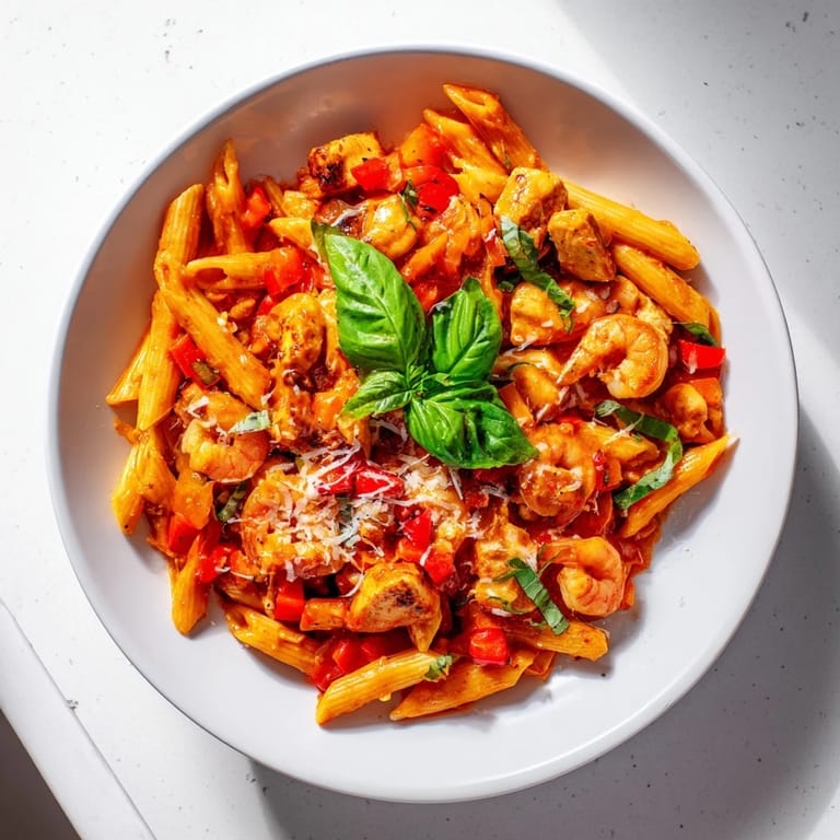 Pin it There's this particular Tuesday evening that comes to mind whenever I make this pasta—the kind of night where my kitchen smelled like garlic and chili heat, and my neighbors started hovering by my door just from the aroma. I'd been craving something with real drama, something that didn't require a fleet of pots and pans, and this one-pot wonder just happened. The shrimp and chicken swimming together in that fiery tomato sauce felt like a small act of defiance against the usual Tuesday routine.