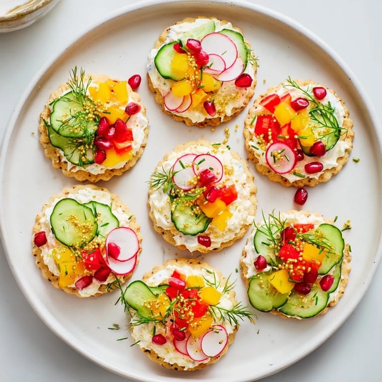 Pin it Festive, colorful crackers topped with creamy spreads, fresh vegetables, and savory garnishes—perfect for holiday gatherings and parties.