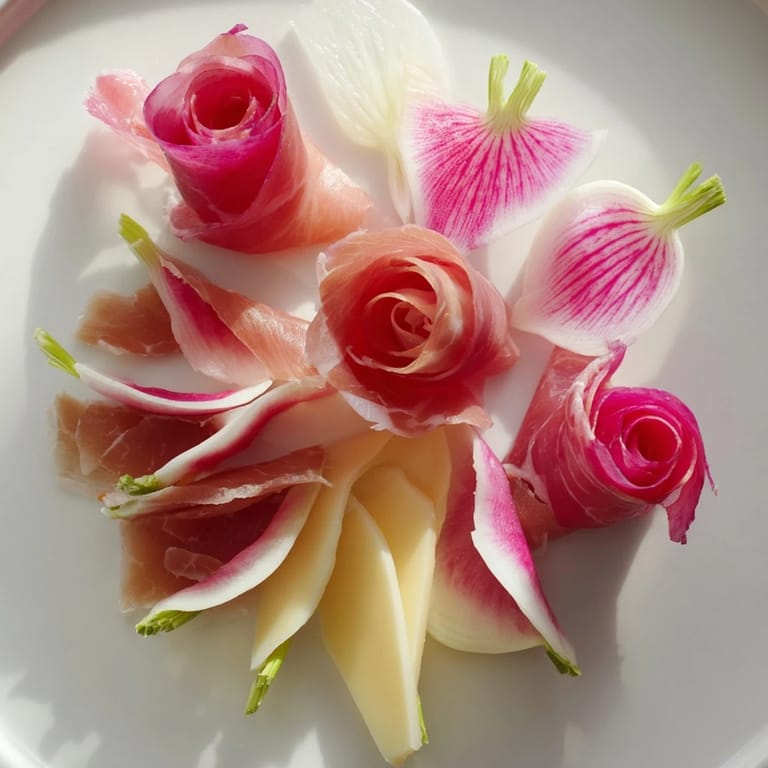 Gently roll or fold thin prosciutto slices into small spirals to resemble rose petals, placing them in groups to enhance the visual effect.